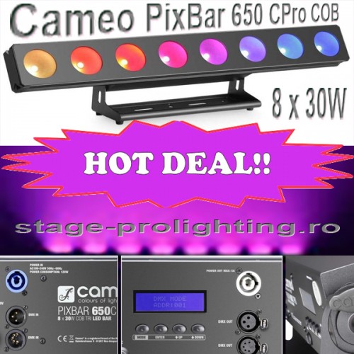The Cameo PixBar 650C PRO is a 53° beam width professional LED bar with 8 ultra bright 30 watt COB-LEDs for solid colour mixing with seamless transition. Highly efficient convection cooling and a 3,600 Hz refresh rate ensure absolutely noiseless operation and flicker free performance. The PixBar 650C PRO is fully RDM compatible for bi-directional communication with a dedicated controller providing addressing, configuration and status reporting of the fixture. It is capable of standard DMX control in 5 modes and standalone, master or slave operation. The PixBar 450C PRO also features autorun software, a built-in microphone for sound control and a backlit display with Mode, Enter, Up and Down keys for manual control. In addition to rich RGB colours and macros calibrated to the LEE filters standard the PixBar 650C PRO provides colour temperature correction, 4 selectable dimming curves and single pixel control for impressive chase effects. The fixture's rugged aluminium enclosure features 3 and 5-pin DMX inputs and outputs, Neutrik powerCON mains connectors and an adjustable stand that doubles as mounting bracket. SPECIFICATIONS: Product type:LED BAR, Type: Washer, Colour spectrum: RGB, Number of LEDs: 8, LED type: 30W COB, Refresh rate: 3000Hz, Dispersion: 53°, DMX input: XLR 3-pin male, XLR 5-pin male, DMX output: XLR 3-pin female, XLR 5-pin female, DMX mode: 2-channel, 3-channel, 3-channel, 9-channel, 30-channel, DMX functions: Pixel Control, 13 Auto-Modes, Sound Mode, Colour Macros, Dimmer, Strobe, Colour temperature correction, Standalone modes: Auto Run, 14 Auto-Modes, Sound Mode, Static,Strobe, Controls: Mode,Enter,Up,Down, Indicators: LC-Display, Operating voltage: 110 V AC - 240 V AC / 50 - 60 Hz, Power consumption: 250W, Power connector: Neutrik powerCON, Housing material: Aluminium, Cabinet colour: black, Cooling: Convection, Illuminance: 3770lx 1m, Dimensions without mounting bracket, Width: 880mm, Height: 110mm, Depth: 130mm,