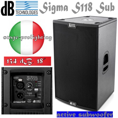 dB Technologies Sigma S118 Sub este un subwoofer activ tip bass-reflex, avand un difuzor de 18" care dezvolta 1400 W/program gratie amplificatorului digital care are incorporat si DSP in 24 Bit incluzand limitator, crossover @80/100 Hz si un SPL maxim de 134 dB. Import Germania, 3 ani Garantie!!!