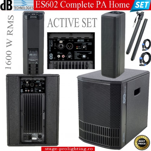 dB Technologies ES602 Complete HomePA SET se compune din doua suburi active, asistate DSP, doua topuri, 2 distantiere si cablurile aferente. Este un sistem micut, dar suficient de puternic pentru un party restrans cu DJ, vand o calitate de invidiat.