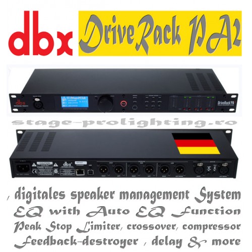 DBX DriveRack PA2 este poate cel mai popular sistem speaker management al momentului si o alegere fara greseala cand nu se accepta compromisuri vis-a-vis de sunetul realizat prin sistemele pasive. Produsul, recomandat de stage-prolighting din toate punctele de vedere, deci si sub raportul calitate/pret, intruneste toate conditiile specifice functiilor pe care le indeplineste cu succes: 31 Band Grafic Equalizer, parametric 8-Band Input-EQ cu Auto EQ Function, Peak Stop Limiter, crossover, compressor, Subharmonic Synthesizer, output-Delay pana la 3,4 m/10 ms, Input-Delay pana la 34 m/100 ms, Feedback-destroyer cu 12x Notch-filters 1/80 Oktave, parametric 8-Band output-EQ pentru acordajul speakerelor , Terz-Band Real Time Analyzer, Pink Noise Generator.