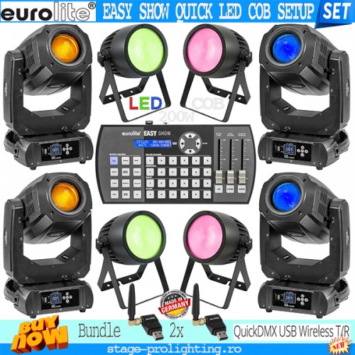 Eurolite Easy Show quick LED COB setup SET, reprezinta un sistem de lumini profesionale de scena, teatru, sau sala de evenimente (preferabil pentru schela de lumini), fiind nu numai rapid si usor de montat, dar si un setup la cheie, “ready to go”, foarte eficient, cu un randament de lumina de invidiat, gratie celor 8 fixturi ( 4 spot moving head + 4 LED Par), fiecare avand la baza cate un LED COB de 200W capabil sa faca nu numai o veritabila baie de lumina pe ringul de dans , dar si efecte spectaculoase. Controlat Wi-Fi prin intermediul celor doua Tx / Rx (transmiter-receiver), transmiterul in portul USB al consolei DMX Eurolite Easy Show, iar receiverul in portul USB al primului movinghead din lantul DMX (acesta fiind inlantuit de celelalte fixturi DMX prin cablurile scurte DMX), intregul ansamblu de lumini va beneficia de preseturile excelente din consola, care vor putea fi schimbate la o simpla apasare de buton, astfel incat pre-programarea consolei nu mai este necesara, avand totodata la dispozitie si celelalte moduri de operare, respectiv: auto, sound, etc.