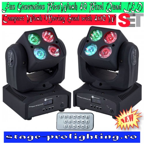 Fun Generation PicoWash 40 Pixel Quad LED este un SET compus din doua moving head-uri, fiecare avand 4X10W quad Colour RGBW LED, controlabil prin DMX, AC 100 - 240 V, 50/60 Hz, Dimensions (LxWxH): 174 x 162 x 228 mm, Weight: 2,8 kg, Shutter / Strobe: 0-20 Hz, Dimmer: 0-100%, cu functii auto si sound. Import Germania, garantie 3 ani!!! Pretul este exprimat pentru o pereche (2 buc).