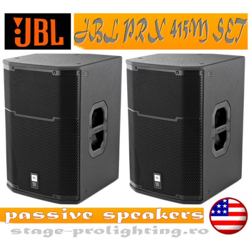 JBL PRX 415M SET este compus din doua boxe, fiecare avand o banda de frecventa 55-19000 Hz, pe doua cai 15"/1", 128 dB maximum SPL si 600W RMS, respectiv 1200 W in sinus.