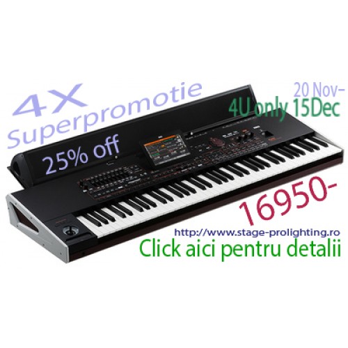 Super promotie oferita de stage-prolighting in perioada 20 Iunie-31 August pentru Korg PA-4X76 inclusiv sistemul propriu de speackers (sound sys). Oferta este limitata la 4 bucati, absolut noi, sigilate, import Germania cu Garantie oferita produsului 3 ani!!!