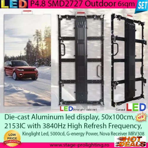 Ecranul are o luminozitate de peste 5000cd/mp, IP 65, fiind oferit acum de producator la un pret "de criza", imbatabil la acest moment. De mentionat cabinetele ultra-slim (de ultima generatie), extrem de usoare, cu un sistem de prindere simplificat la maximum, ceea ce permite montarea lui de catre o singura persoana in doar cateva minute. Ecranul este deopotriva destinat activitatilor de tip rental, cat si fixe, avand optiunea de a alege formatul cabinetelor: drept, sau curbat, cadrul fiind din aliaj de Aluminiu. Specificatiile tehnice de baza il califica si pentru difuzarea capturilor in real time, practic acest ecran comportandu-se ca un monitor in real time, cu latenta minima (data fiind rata de refresh de 3840Hz), ultra-rapida. Import extra-comunitar, plata integral anticipat.