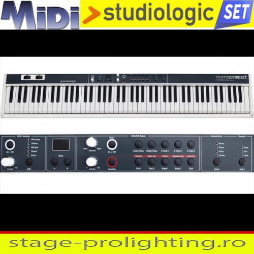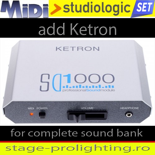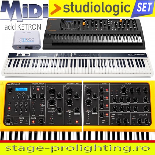Keyboards MIDI SETUP, bazat pe un master keyboard excelent sub raportul calitate/pret: Studiologic numa compact. In configurare s-a tinut cont de perechea extraordinara pe care acest master keyboard o face cu synth-ul Sledge cu „motor” Waldorf care completeaza cele 10 sounduri proprii (standard) cu peste 1000 de synth-sounds perfect mixabile in real time din balansul MIDI aflat la indemana pe MK. Pentru a putea avea la dispozitie oricand si o veritabila banca de sunete GM si nu numai s-a insertat in setup si modulul Ketron SD 1000. Setarea facandu-se pe canale MIDI separate, (sau pe acelasi canal), se pot obtine astfel multiple combinatii beneficiind de conectivitatea Thru MIDI. Tastatura semi-grea FATAR a MK completeaza acest setup, ridicand intreg ansamblul la nivel PRO, excelent in aplicatii LIVE si studio. Latenta intregului sistem este minima. Import Germania, 3 ani garantie!!!