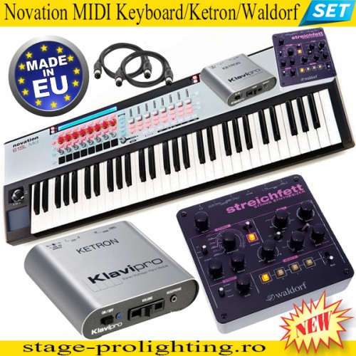 Novation MIDI Keyboard/Ketron Clavi-pro/Waldorf SET este o alegere excelenta atat pentru aplicatii LIVE, cat si pentru studio. Combinand soundurile din cele doua module prin functiile dual MIDI si Layer, sau split se obtin sound-uri complexe pe care cu zgarcenie le poti gasi in keyboard-uri mult mai scumpe. Beneficiind de editarile (controller) MIDI pe care le ofera MIDI master keybord-ul Novation, precum si celelalte controllere din modulul synth Waldorf cu o superba colectie de pad-uri, practic posibilitatile devin infinite, distingandu-se bineinteles cele 12 piane si el-piano din modulul Ketron-Clavi-pro. Astfel, piano-layerele cu strings/pad precum si alte combinatii va vor surprinde, lasandu-va placut impresionati nu numai de calitatea timbrelor, dar si de raspunsul modulelor cu latenta "0", iar claviatura semi-grea a keyboard-ului va va intari feeling-ul ca aveti in fata un keyboard mult mai performant. Una din cele mai bune combinatii low-cost ale momentului. Set recomandat de stage-prolighting sub raportl calitate/pret.