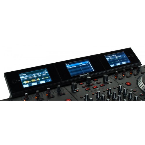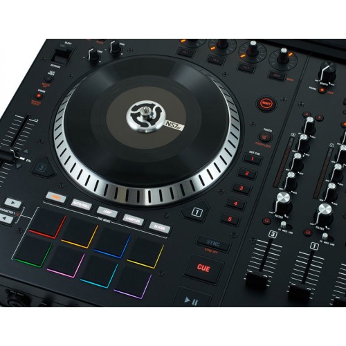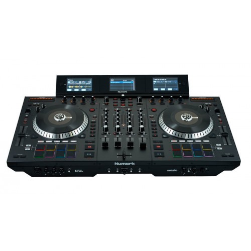Numark NS 7 III, Premium Serato DJ controller with three high-resolution color screens, including the ability to display stackable waveforms, Stacked parallel waveforms on central screen for simple, direct visual beat matching Screens provide 1:1 real time feedback of Serato DJ, letting you close or move the source laptop and focus on the music, Dedicated track library screen with corresponding navigation controls, 4 decks of Serato DJ software control; built-in 4-channel audio mixer, 2 variable-torque motorized platters with high-resolution MIDI tracking, Touch-activated knobs produce groundbreaking control of filters, EQ, and more, Authentic vinyl records provide the feel of a professional DJ turntable, 16 velocity-sensitive Akai Professional MPC pads with backlit RGB feedback, 10 pad modes for hot cues, loops, song slicing, and sample triggering, Dedicated 3-way touch-activated filter knob on each channel, Dedicated touch-activated control of Serato’s 12 professional iZotope FX, Built-in professional 24-bit USB 2.0 audio interface, Zone/booth outputs and balanced XLR outputs for club use, Rugged, road-worthy metal construction, Serato NoiseMap ready for use with extended DVS setups, Plug and play with Serato DJ (included).