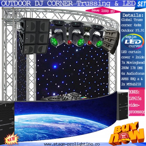 Sistemul este gandit pentru aplicatii in exterior (pe plaja, la piscine mari, etc), dar poate fi folosit cu succes si in interioare. Sistemul de sonorizare inclus are 8300W RMS fiind asistat DSP, autoamplificat cu Powersoft. Ecranul LED reprezinta la ora actuala cea mai buna optiune pentru exterior PITCH3.91mm-O sub raportul calitate/pret. Este comandat de videoprocesorul LVP 615s care are incorporat MCTRL300, sistem NOVA (cel mai stabil).