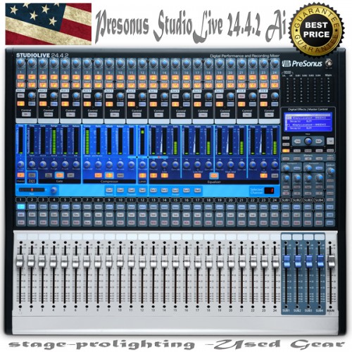 Acest mixer digital Presonus StudioLive 24.4.2 Ai, este ca si nou, avand o uzura de maxim 10% (practic are cateva zgarieturi pe carcasa in partea inferioara si au fost scrise canalele sub cursoarele liniare, care cu putin efort pot fi sterse - MF), in rest este functional 100% si in parametri. Este importat din SUA (pretul de nou pentru acest produs este de 11300 RON) si se vinde la 67% din valoarea lui, deci cumparatorul beneficiaza de o reducere de 33%. Fiind un produs considerat second-hand nu se ofera garantie.