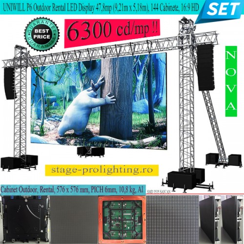 UNIWILL P6 Outdoor Rental LED Display 16:9 HD este un ecran gigant cu LED-uri, tip SMD 3535, PICH 6mm, dedicat aplicatiilor de inchiriere, atat outdoor, cat si indoor. Rezolutia excelenta a acestui ecran de 32x32x9x144 =1327104 pixeli, respectiv 1536 x 864 pixeli) – peste 720p, promoveaza acest ecran cu o luminozitate >6300 cd/mp in categoria HD: format video 16:9, excelent atat pentru preluarea in real time a shooting-urilor de pe camcordere, cat si pentru redarea oricarui format video cunoscut in format wide. Insotit de un video procesor de asemenea excelent, care permite multiple intrari (composite, S-video, DVI,HDMI, SDI,HD-SDI,VGA) si iesire LAN, ecranul poate fi comandat Synchronous display de un PC prin portul DVI cuplat la vidoprocesor, sau semnalul video poate fi preluat in videoprocesor direct din camcordere, DVD, laptop cu external box (pentru sending card, etc, trimiterea semnalului la ecran facandu-se din videoprocesor direct prin portul UTP la o distanta de 100m, sau prin fibra optica la 10 km. Dimensiunile ecranului sunt 9,216 m x 5,184m x 0,07m repectand intocmai formatul 16:9, iar configurarea lui in 144 de cabinete se face astfel: