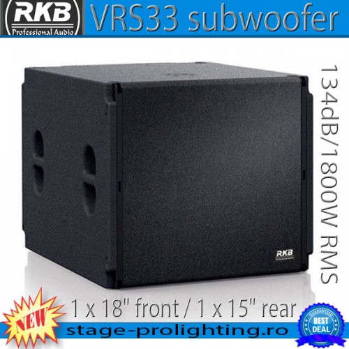 - VRS33 is a unique design, with an 18 inch subwoofer at the front and a 15 inch subwoofer at the back. Dual-channel control gives a forward directed bass radiation with a damping of up to 15 dB in the rear. This results in a much more solid, tight and musical bass sound, especially in environments with difficult acoustics. Also actors on the stage and neighbors behind the venue are being spared from too much low frequency energy.