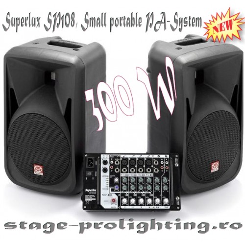 Un sistem portabil PA de 300W cu mixerul detasabil de pe una din boxe. Speakerele sunt dotate cu difuzor de 8" si driver de 1" si acopera o banda de frecventa surprinzator de buna: 55-20000Hz conform producatorului Superlux. Mixerul are 8 canale, autoamplificat, EQ pe doua benzi si procesor de efecte. Sistemul este completat de doua cabluri de boxe si cablu de alimentare care se gasesc in cea de a doua boxa care are de asemenea o placa detasabila in partea din spate. Sistemul este compus din doua boxe cu subansambluri detasabile.
