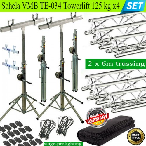 Schela VBM TE-034 Towerlift 125kg x 4 SET este o schela de lumini front-back (fata-spate scena). Avand 6m lungime in fata scenei si 6 m lungime in spatele scenei, aceasta schela de lumini permite amplasarea luminilor pentru scena din spate, iar in fata scenei a luminilor si eventual a modulelor line-array pentru sala si ringul de dans, conturand astfel mult mai bine atat scena, cat si lumina pe sala. Impresia artistica a unui astfel de setup de lumini este mult sporita si datorita cortinei care se prinde de schela din spate, scotand in evidenta atat echipamentul back-stage, cat si artistii care evolueaza pe scena. Import Germania, 3 ani garantie!!! Setup recomandat de stage-prolighting.