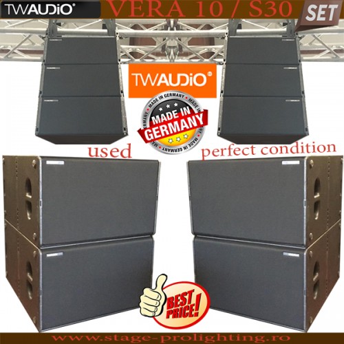 TW Audio T10 - S30 small line-array SET se compune din 6 module TW Audio T10 si 4 subwoofere TW Audio S30, toate made in Germany. Produsele sunt second-hand, in perfecta stare de functionare, estetic arata 9 din 10, nu au fost folosite la touring, ci doar ocazional la coorporate events, sunt importate din Belgia. Detaliile tehnice se gasesc in pagina producatorului german TW Audio, dar si in paginile anterioare ale magazinului nostru. Sub raportul calitate/pret, o oferta de nerefuzat. Stocul este limitat, astfel incat doritorii sunt invitati sa nu ezite prea mult, la acest pret produsele vor fi rezervate foarte repede, deci oferta este valabila doar in limita stocului disponibil ramas. Produse recomandate de magazinul nostru, avand o garantie de 30 de zile.