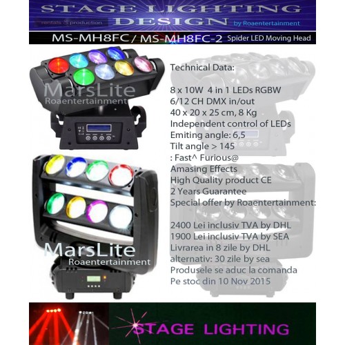 Moving Head Cu 8 LED-uri de 10W, (4 in 1 RGBW), DMX ch 6 si 12, cu unghi de deschidere a razelor de 6,5 grd, Tilt:145 grd, joc spectaculos de lumina si culoare, montabil pe truss in orice pozitie. Dimensiuni: 40 x 20 x 25 cm, Greutate 8 kg. Garantie 2 ani