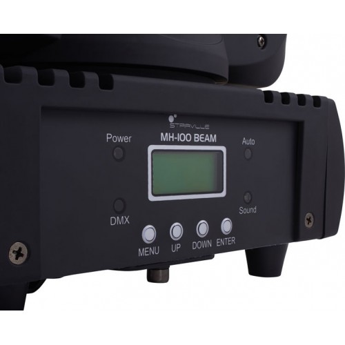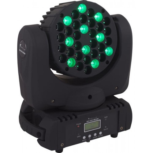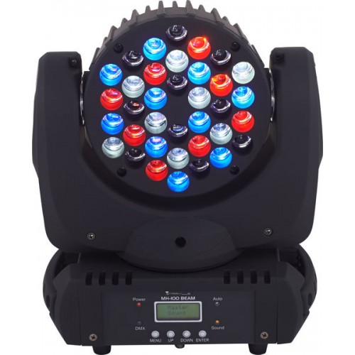 Stairville MH -100 Beam 36x3W LED Moving Head. Beam Moving Head with 108W total LED power and RGBW color, mixing. The MH -100 Beam projects a very narrow beam that sweeps like a lightsaber on the stage or the club. The optical, system with 8 ° beam angle also ensures a near perfect colour mixing in the light beam . The enormous power of the light, beam coming from 36 pcs 3W CREE LEDs . It can be controlled either via DMX512, Sound Active or Master / Slave, mode. Specifications : Light source: 36 pcs 3W CREE LEDs ( 8x red, 10x green, 10x 8x blue & white), total LED power, 108W, optics : beam angle 8 °, luminous flux: 62.000 Lux @ 1 mtr., Dimmer : Linear 0-100% Shutter: Electr. Strobe Effect, distraction : PAN : 630 ° TILT : 220 ° Control: DMX -512 ( 9 or 14 DMX channels), Sound Active (music based) or, master / slave, LCD display with 4 buttons to set all the functions. Mounting: Quick-Lock Omega brackets, DMX input, and output : 3-pin XLR. Power supply: 100 -240V, 50Hz/60Hz, max. Power consumption : 175W, cooling : Fan cooled,, Dimensions: 320 x 260 x 148 mm (HxWxD), weight : 4,9 kg