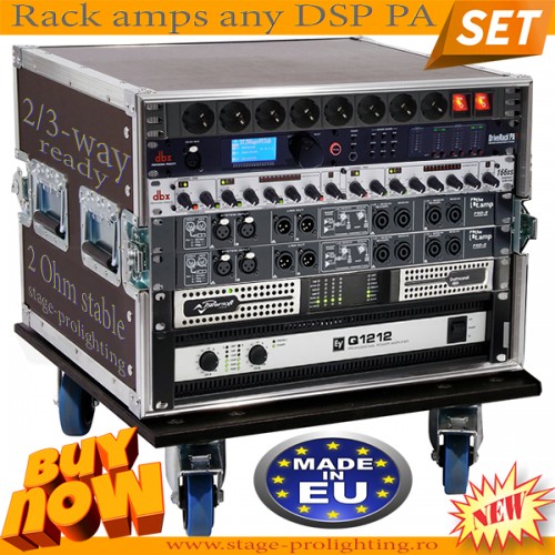 Rack Amps any DSP PA este un rack de amplificare universal gata configurat foarte flexibil, usor adaptabil oricarui sistem PA care are nevoie de DSP pe 2, sau 3 cai, compresie si limitare pe joase si o buna distributie a mediilor si inaltelor in top-urile pe care le detineti. Poate fi folosit cu succes atat la PA-urile standard, cat si la configurarile line-array. Distributia frecventelor se face din start pe 2, sau 3 cai (in functie de speakere-le detinute) din dbxPA2 folosind unul din preseturile dedicate (care pot fi apoi post-editate in functie de preferintele dvs si caracteristicile tehnice ale speakerelor si sub-uri, astfel incat daca se alege varianta pe 3 cai, cele doua iesiri low vor fi dedicate suburilor fiind trimise prin intemediul dbx 166XL catre EV1212, iar iesirile din dbxPA2 MID si HI (cu MID +1/-1, respectiv HI +2/-2) directionate catre Powersoft 4804. In panel 1, iesirile A,B,C,D vor fi cuplate cate doua in mufele speakon 4NLC (bi-amp) , iar intrarile link-uite, avand grija sa fie folosite mufele din fata (A+B, respectiv C+D), iar Powersoft 4804 va fi setat in bridge, astfel obtinandu-se cele 3 cai: una pentru subur (+1/-1 in panel 2) si bi-amp pentru top-uri (in care +1/-1 este rezervat MID, iar +2/-2 Hi). Daca sunt folosite sub-uri cardio se foloseste aceeasi reteta si pentru panel2 ca la panel 1.Pentru o mai buna compactizare a sunetului recomandam un delay in Powersoft 4804 de 14ms, iar senzitivitatea intrarii la -4dB. O compresie 2:1 cu thresold mic si o limitare de 25% va conferi sub-urilor un punch suplimentar si mai multa inteligibilitate.