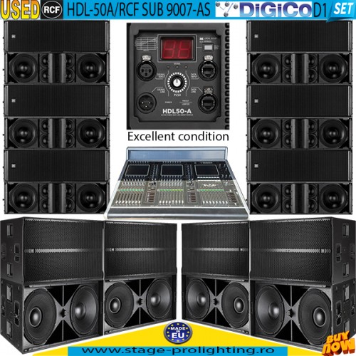 RCF HDL50-A-SUB9007-AS-DiGiCo D1 Used SET este format din 8 RCF SUB9007-AS, 12 RCF HDL50-A, si un mixer digital DiGiCo D1. Sistemul este in stare excelenta, folosit, si se ofera o garantie de 3 zile pentru verificari.