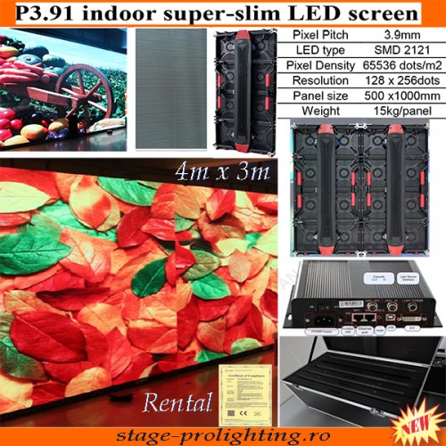 Rental Indoor P3,91 super-slim LED Screen 12mp, este un ecran cu LED-uri Indoor, Rental, avand 24 cabinete cu dimensiunile 1m x 0,5m, cu o suprafata totala de 12mp, format standard 4m x 3m (dar poate fi configurat oricum), PITCH 3,91mm, super-subtire, foarte usor (tot ecranul are 360kg), fiind comandat prin intermediul unui external box care poate fi legat prin DVI cu orice laptop, sau PC care permite instalarea softului. Ecranul se aduce numai cu pre-comanda, plata integral anticipat, transport maritim in 31 de zile, import extra-comunitar. Ecranul are o rezolutie excelenta pentru interior, putand reda orice fisier si toate formatele video cunoscute. Pentru mai multe relatii, specificatii tehnice auxiliare si performante, va rigam sunati la magazin.