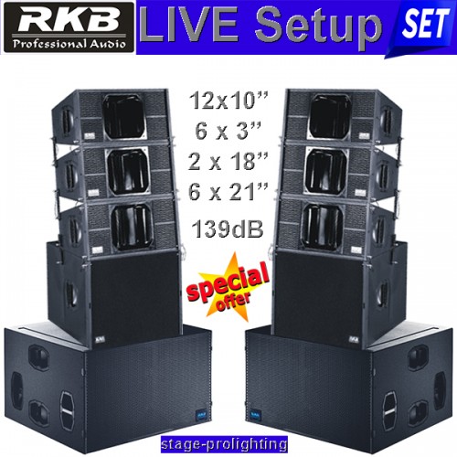 RKB Live Setup SET se compune din 6 module line-array fiecare avand cate 2 x 10 " neodym si 1 x 3"neodym driver, 2 subwoofere 1 x 18"si 2 sub-Infra 2 x 21". Intreaga banda de frecventa de la 27 Hz la 19000 Hz fiind acoperita la o putere apreciabila de 14000 W RMS, acest sistem de speakere astfel configurat face fata cu brio la orice tip de aplicatie LIVE, sau DJ. Deoarece toate speakerele sunt pasive recomandam amplificatoarele din seria FP, respectiv 10000Q si 14000Q, primul in 4 canale deservind pe un canal cele doua suburi de 18" in paralel, pe celelalte 3 canale fiind cate doua top-uri in paralel, iar FP14000Q va deservi cele doua Infra-Sub. Totul sub controlul unui procesor de sistem 2 in-6 out care in primul rand va aplica crossoverarile necesare pentru fiecare canal in parte. La acest sistem, pentru un raspuns cat mai bun si exact este foarte important reglajul delay-ului din management sistem, deoarece joasele trebuie aliniate cu atat mai mult cu cat avem doua tipuri de subwoofere, de asemenea si reglajul sub-armonicelor, altfel sistemul va fi dezechilibrat, iar "muscatura" joaselor nu va fi aliniata cu topurile care vor avea raspuns mult mai rapid. O aliniere corecta ca raspuns va transforma acest sistem intr-o mica bestie. In absenta unui procesor de sistem, folosind doar amplificatoare fara DSP, acest sistem nu va da nici 40% din randamentul si claritatea sunetului pe care o poate oferi. Un dbx (de ex) 260 care sa deserveasca sistemul ar fi numai bun. De asemenea, in special in aplicatiile LIVE, o compresie marita pe cele doua Infra (facuta ori din procesorul de sistem, ori folosind cu compresor auxiliar) va mari claritatea joaselor la o diminuare a volumului cu pana la -10dB, facand sunetul si mai compact. Sub raportul calitate/pret, acest sistem in configuratia descrisa este mai mult decat competitiv, fiind ofertat de producatorul RKB la nici jumatate din pretul concurentei. Indicat mai mult pentru instalatii fixe, decat mobile, in special din cauza greutatii celor doua Infra (avand cate 150 kg fiecare), sistemul ramane insa clar o optiune in fata unui buget limitat. Reglat si operat corespunzator, sistemul uimeste atat prin claritatea sunetului, cat si prin forta lui. Produs recomandat de stage-prolighting.ro