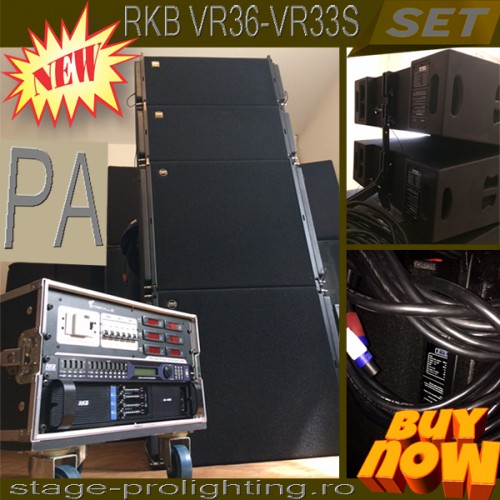 Configuratia standard pentru un sistem capabil sa faca fata fara probleme la un eveniment cu 500-600 persoane este insa 4 x VR36 + 4 x VRS33 cu doua amplificatoare AK-4130 care va opera in 4 Ohm/canal, obtinandu-se o putere totala de 16 kW, cu crossoverarile aferente facute de procesorul de sistem RKB DX448. De remarcat este flexibilitatea sistemului in sensul upgradarii ulterioare pentru sisteme mai mari, sau chiar aplicatii outdoor. Pentru cunoscatori, care stiu ce fel de clone sunt toate aceste componente, excelent realizate, este de asemenea de remarcat raportul calitate/pret exceptional, fiind practic de 4 ori mai scazut pretul fata de originale la un randament practic asemanator, ceea ce face acest sistem sa fie cat se poate de competitiv. Sistemele se configureaza la cerere si pot fi aduse by air in numai 10 zile direct de la producatorul Hongxiang ai carui re-selleri oficiali suntem incepand cu acest an. Achitarea comenzii se face integral in avans, iar pentru cantitati mai mari plata este garantata cu Bilet la Ordin. Garantia oferita este de 2 ani pentru fiecare component in parte. Toate incintele sunt vopsite cu vopsea germana, au componente numai neodym, ceea ce le confera fiabilitate sporita. Electroliticii din amplificator sunt Siemens, iar finalii sunt de cea mai buna calitate. DSP-ul managementului de sistem este o completare importanta a amplificatorului, astfel incat utilizarea in absenta unui procesor de sistem se exclude, care avand 4 in si 8 out este suficient pentru upgradari cu multiple amplificatoare (max 4 per rack). Calitatea sunetului este foarte buna, avand claritate in toata banda de frecvente bine distribuita. Pentru aplicatiile LIVE indoor cu pretentii, configuratia minima recomandata este dubla fata de cea prezentata, deci cel putin 4 x VR36 + 4 x VRS33. Sistemul de prindere este de asemenea flexibil, top-urile si basii putand fi atat suspendati, cat si grounded. Pentru suspendare sunt necesare si disponibile fly-ing bar-uri dedicate, precum si toate celelalte accesorii suplimentare (neincluse in pret).