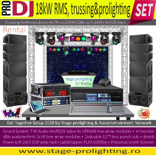 PRO DJ battle Rental SETUP reprezinta un setup complet pentru DJ, sau aplicatii LIVE, la cheie, pentru evenimente cu pana la 2000 de participanti, incluzand atat sistemul de sonorizare, cat si trussing, podium si lumini profesionale. Sistemul de sunet are 18000W RMS, la 142 dB, fiind format din 6 subwoofere si 6 module line-array, precum si monitorizare, totul asistat de mixer digital. Configuratia, deja testata de tehnicienii nostri, raspunde foarte bine in toata gama de frecvente, avand nu numai forta si dinamica, iar sunetul obtinut are o calitate exceptionala provenita din claritate si penetranta, fiind foarte bine echilibrat din DSP-urile amplificatoarelor dedicate. Luminile, asistate DMX, sunt atat spot/beam, cat si washere, astfel incat ringul de dans si locatia vor fi efectiv sub o baie de lumina si culoare. Pretul exprimat este per ziua de inchiriere (12 ore), setup-ul si transportul la locatie, asigurat de tehnicienii nostri, fiind inclus pentru o raza de 30 km. Sistemul se inchiriaza numai pe baza de contract, iar rezervarea lui pentru o anumita data se face cu un avans de 50%. In eventualitate ca doriti sa achizitionati un astfel de sistem, pentru ultima cotatie de pret va rugam sunati la magazin.