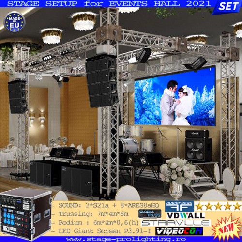 Stage Setup for Events Hall 2021, reprezinta una din propunerile magazinului nostru sub forma solutiei complete in ceea ce priveste scena, cuprinzand ecran cu Led-uri, partea de alimentare si controllere LED si DMX, podium modular 24mp, Schela de lumini in 4 puncte, sunet si lumini.