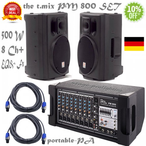 Set PA portabil de la the t.box, format din doua monitoare (boxe) pasive PA 110 pe doua cai (10" +1") de cate 250 W RMS fiecare, cu mixer auto-amplificat 250W RMS Stereo@ 4 Ohm, 8 canale + 1 canal stereo + EQ + Efecte (99 preseturi), incluzand si doua cabluri de boxe speakon-speakon. Import Germania, 3 ani garantie. Acest micut sistem de amplificare este una din cele mai low-cost variante posibile la puterea de 500 W RMS si se compune din: