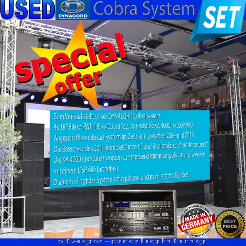 4x 18" Bässe PWH 18, 4x Cobra Top, 2x Endstufe XA 4000, 1x DSP 600
