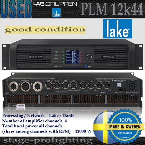 LabGruppen-Lake PLM 12k44 este un amplificator de mare performanta, avand 12000W, 4 canale, exceptional din toate punctele de vedere. Produs in Suedia, calitatea acestui produs depaseste orice asteptari, putand fi folosit in orice tip de aplicatii touring, rental, LIVE shows, sonorizari diverse atat cu echipamente line-array, cat si speakere normale pe masura lui. Starea acestui produs este: folosit, good condition (conditie buna), avand doar 1 an de functionare dupa prezentarea brokerului contractat. Pozele reale ale produsului sunt prezentate numai la cererea clientului, ocazie cu care se va comunica si ultima cotatie de pret si disponibilitatea. Din momentul confirmarii disponibilitatii si a ultimei cotatii de pret, produsul poate fi adus in 8-10 zile prin import intracomunitar avand TVA inclusa si nedeductibila, dar numai cu plata prin banca integral anticipat. Momentan acest produs nu se afla in stocul magazinului stage-prolighting, fiind insa rezervat de magazinul nostru online numai pentru clientii din Romania. Precizam inca o data ca factura fiscala va contine TVA inclusa si nedeductibila pentru firmele interesate. Produsul odata adus are o garantie oferita de 48 de ore din momentul livrarii pentru verificari, iar conditiile de returnare, sau dupa caz de inlocuire a produsului se poate face numai in acest interval de timp oferit, conform contractului de agreement in prealabil semnat intre client si magazin inainte de achizitie.